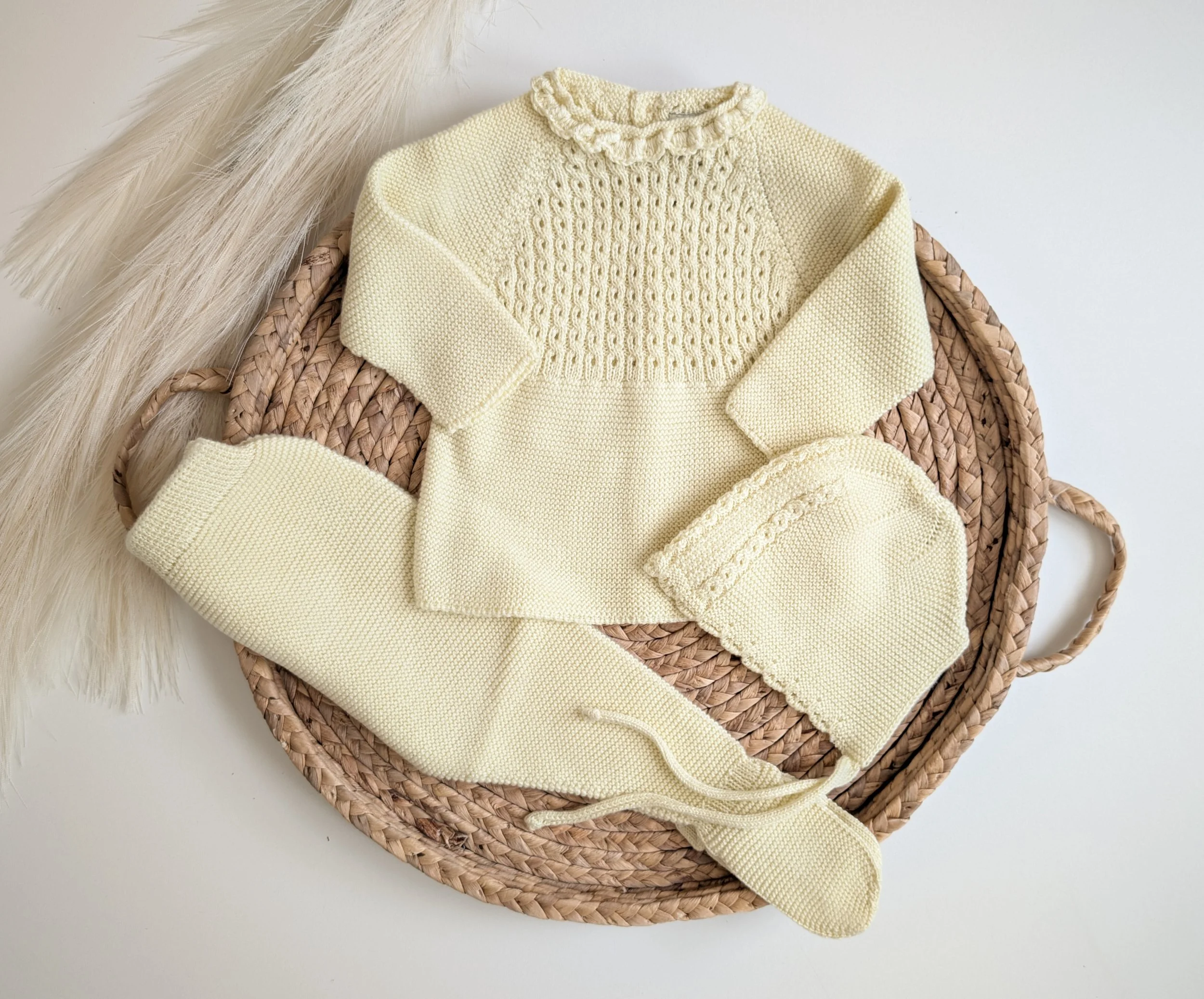 Handmade newborn knit cotton set: Spanish-style baby outfit in steel blue.