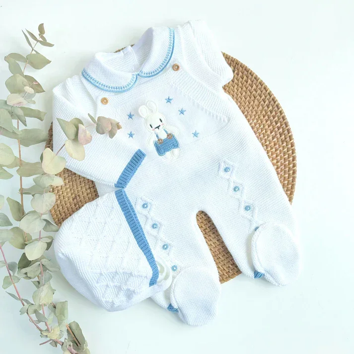 Knitted three-piece set for newborn in light blue and white, ideal for leaving the hospital or as their first outfit.